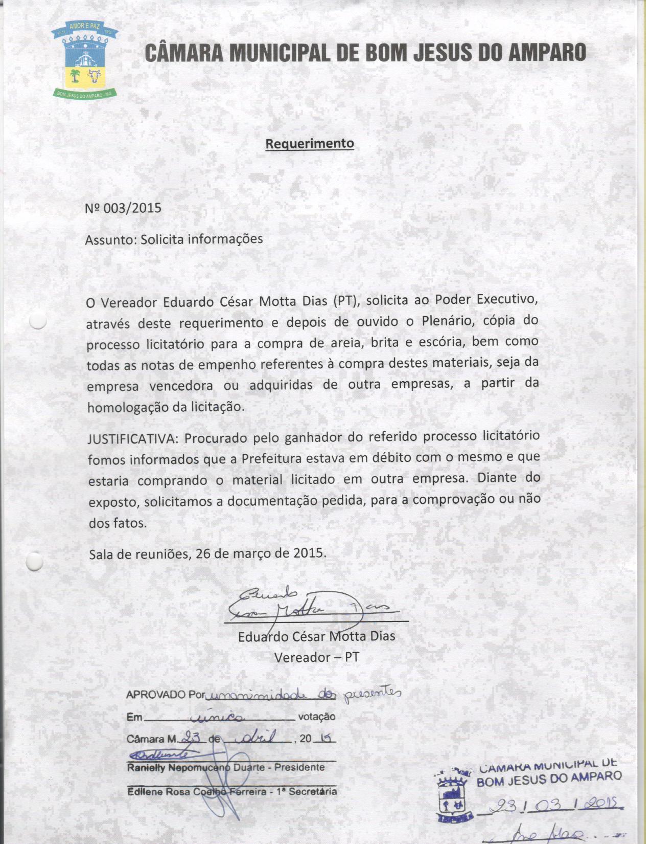 ![]() REQUER CÓPIA DO PROCESSO LICITATÓRIO PARA COMPRA DE AREIA, BRITA E ESCÓRIA, BEM COMO TODAS AS NOTAS DE EMPENHO REFERENTES A COMPRA DESTES MATERIAIS.