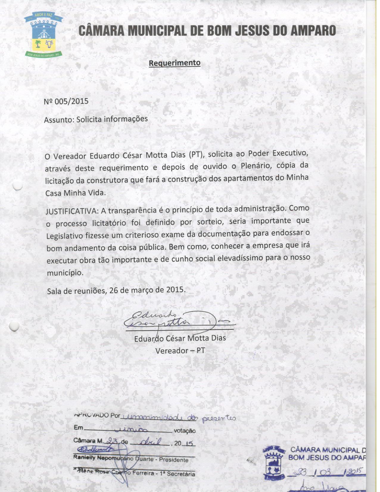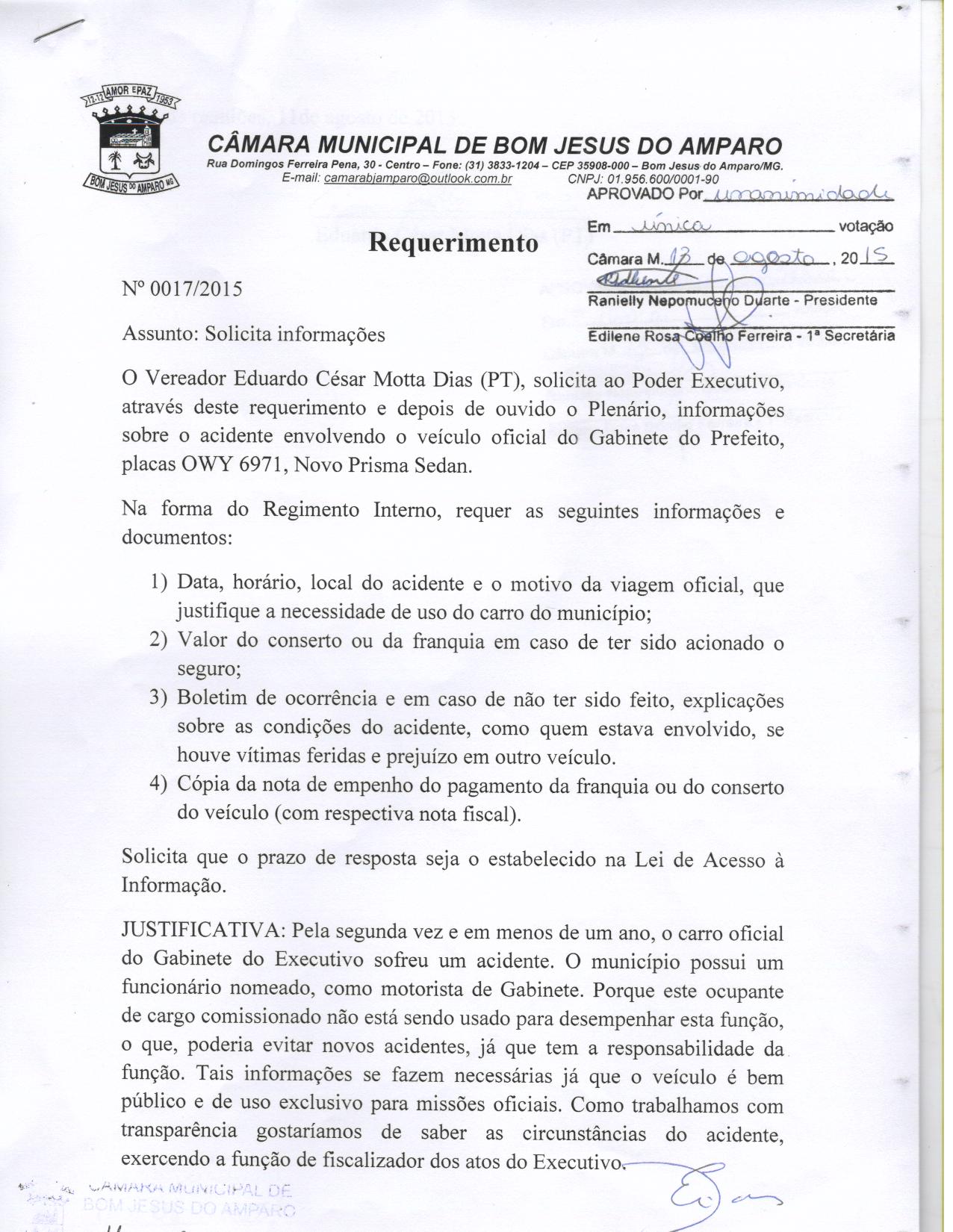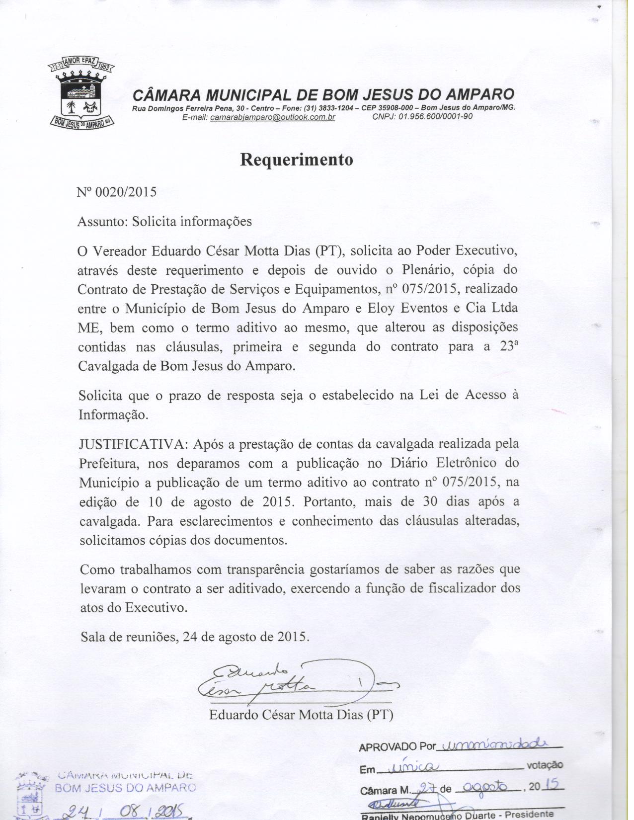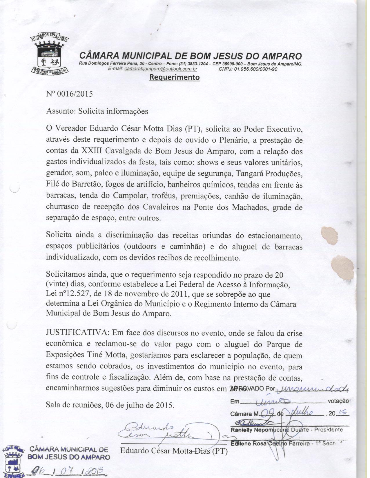 ![]() REQUER A PRESTAÇÃO DE CONTAS DA XXIII CAVALGADA DE BOM JESUS DO AMPARO DE 2015.