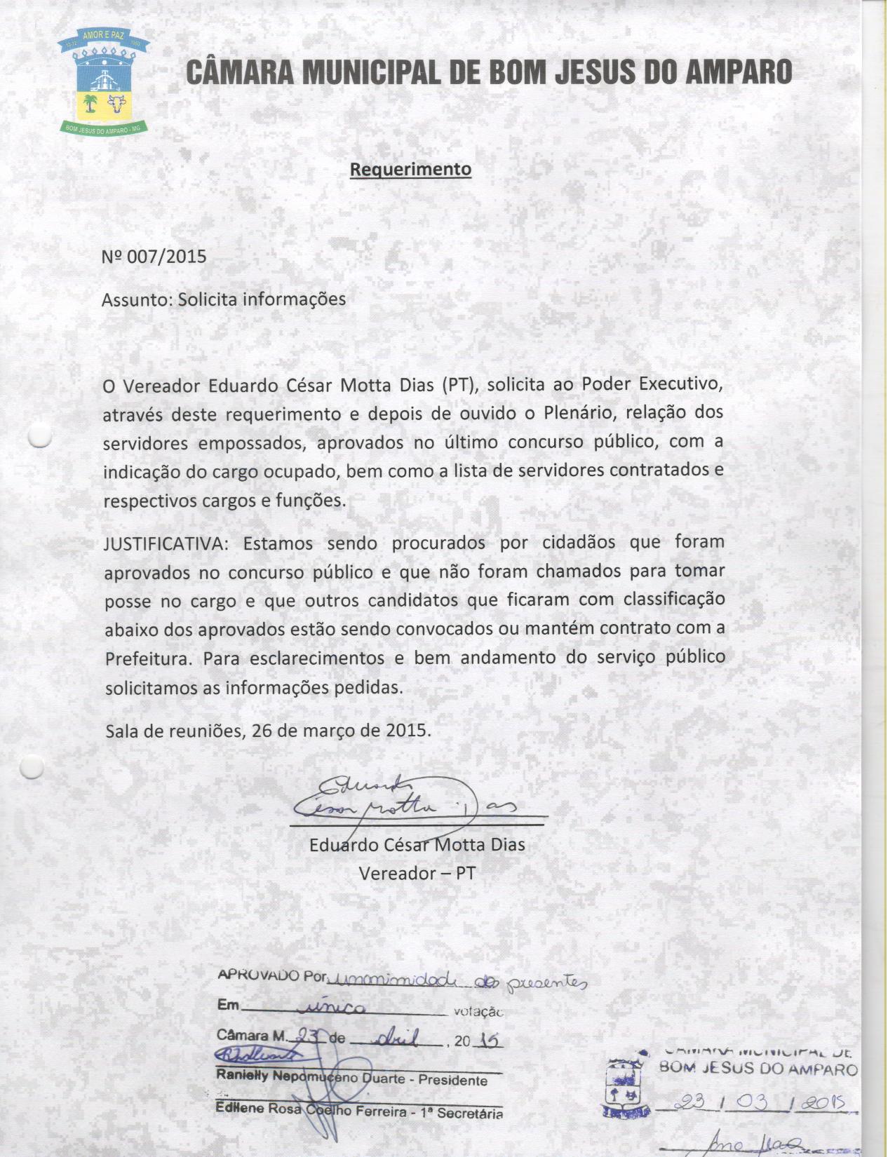 ![]() REQUER TODA RELAÇÃO E INFORMAÇÕES DE SERVIDORES EMPOSSADOS, APROVADOS NO ULTIMO CONCURSO PÚBLICO, BEM COMO A LISTA DE SERVIDORES CONTRATADOS E RESPECTIVOS CARGOS E FUNÇÕES.