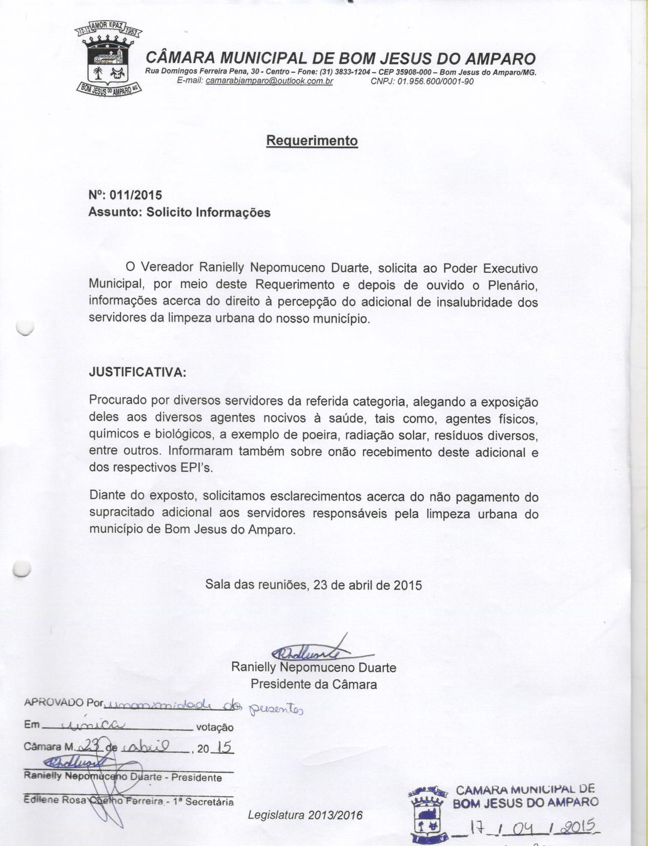 ![]() REQUER INFORMAÇÕES ACERCA DO DIREITO À PERCEPÇÃO DO ADICIONAL DE INSALUBRIDADE DOS SERVIDORES DE LIMPEZA URBANA DO MUNICÍPIO.