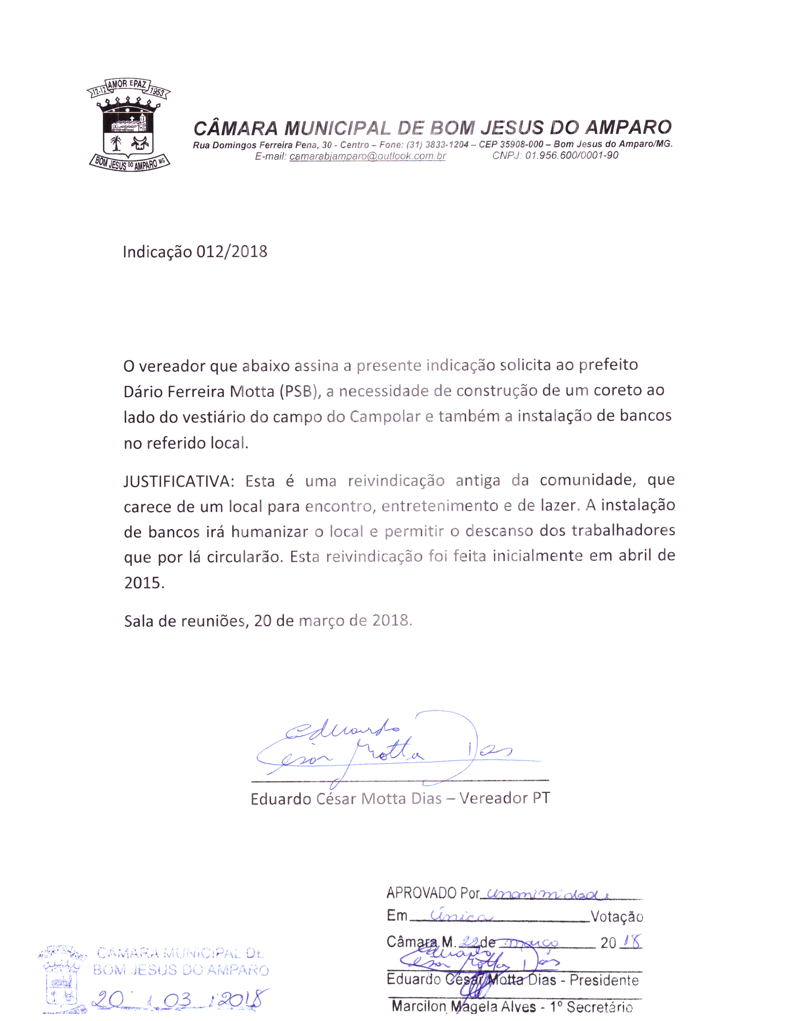 NECESSIDADE DE UM CORETO AO LADO DO VESTIÁRIO DO CAMPO DO CAMPOLAR, BEM COMO A INSTALAÇÃO DE BANCOS NO REFERIDO LOCAL.