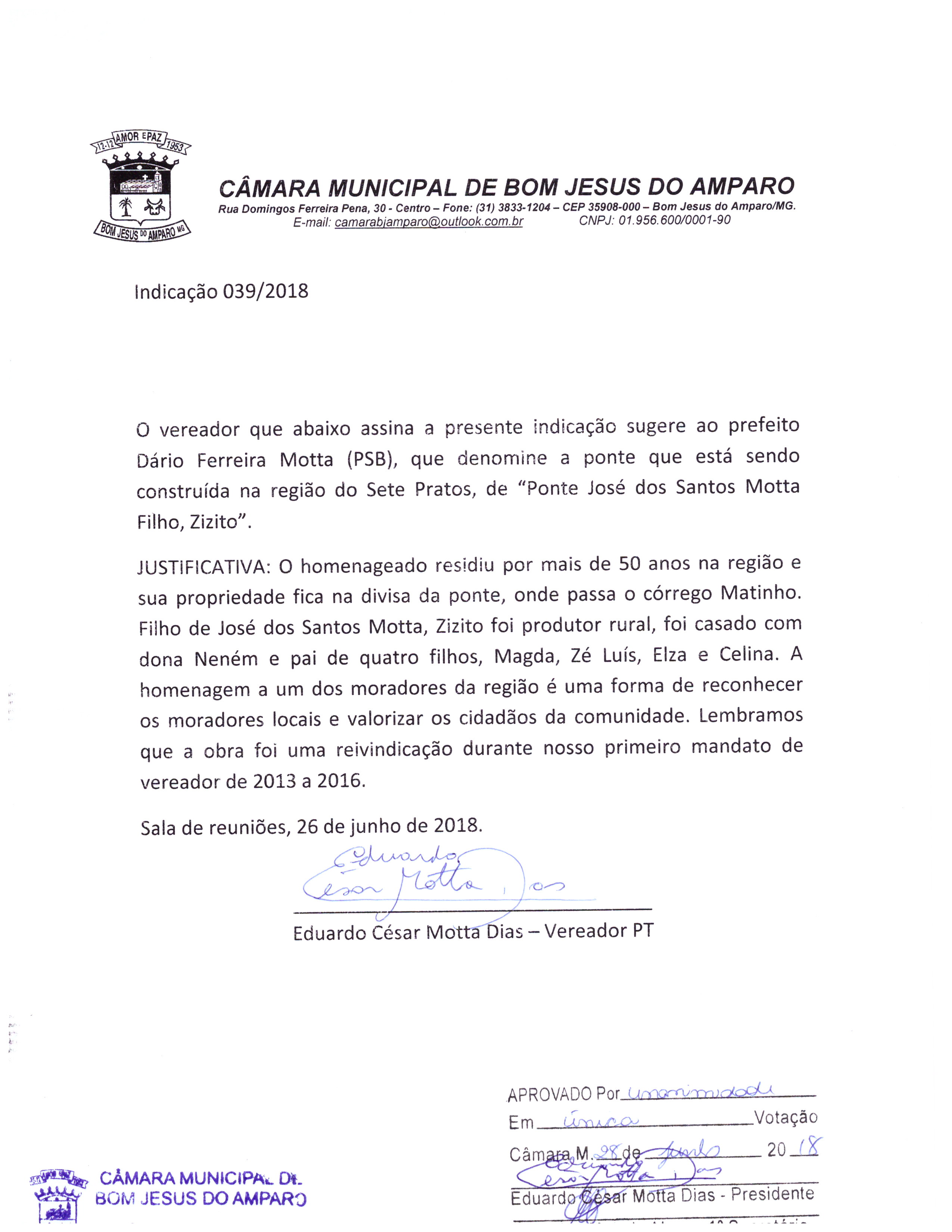 NECESSIDADE QUE DENOMINE A PONTE QUE ESTÁ SENDO CONSTRUÍDA NA REGIÃO DE SETE PRATOS, DE "PONTE JOSÉ DOS SANTOS MOTTA FILHO", ZIZITO.